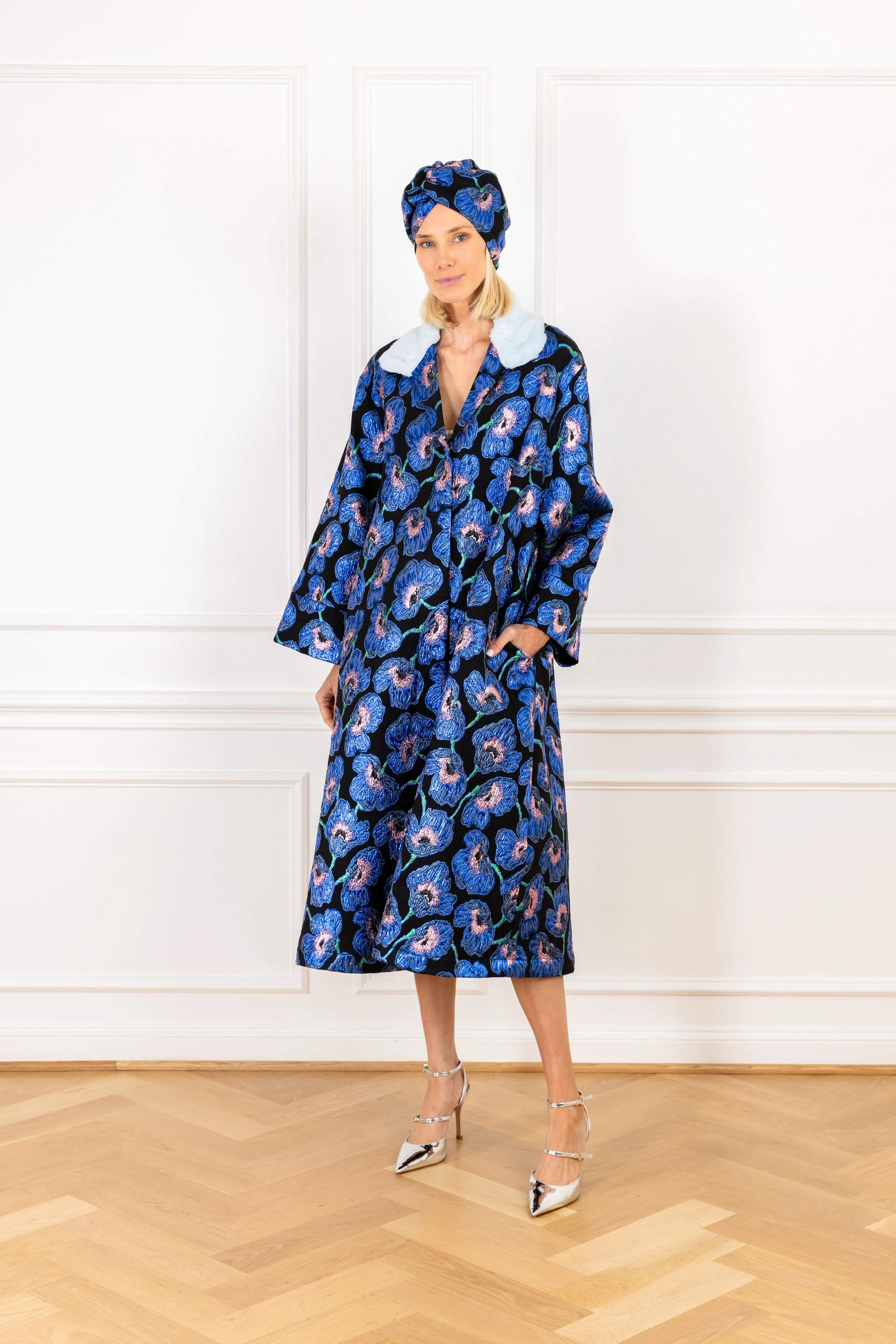 this dress coat features blue & peach textured floral motifs on a brocade fabrication with a light blue fur trimmed collar. this handcrafted piece showcases a voluminous fit, and is the perfect special occasion piece to wear from fall into the holiday season.