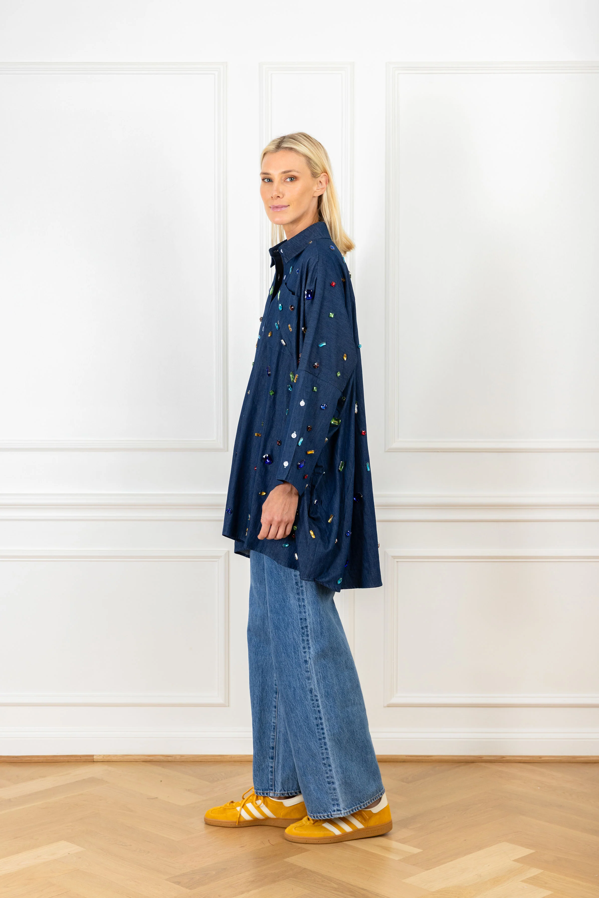 the slouchy fit you know and love, designed for an oversized and elevated look. this shirt features a dark chambray fabrication in 100% cotton, adorned with multicolored gemstones in varying shapes.