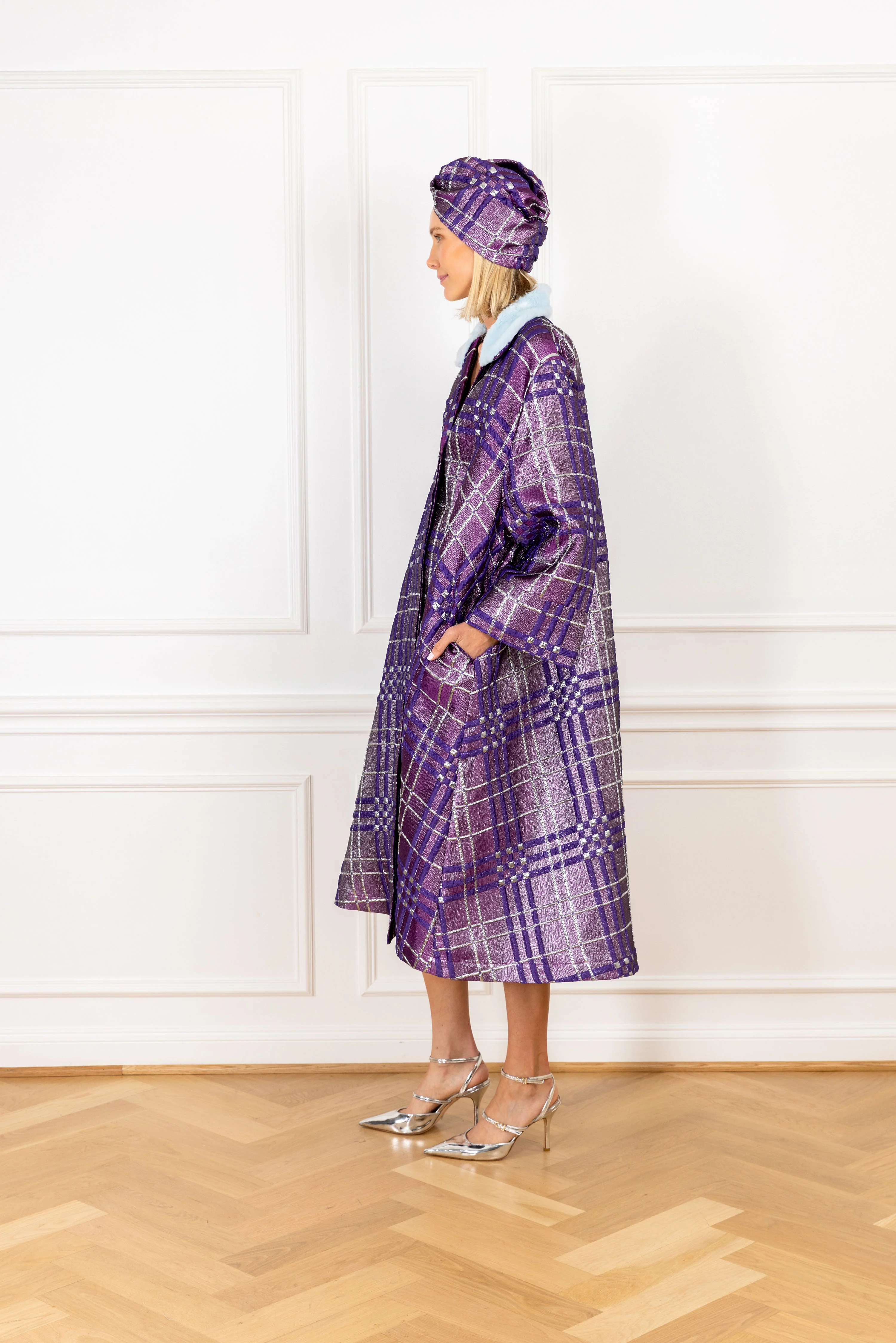 this dress coat features a metallic indigo plaid design with a contrasting blue fur trimmed collar on a structured brocade fabrication. this handcrafted piece showcases a voluminous fit, and is the perfect special occasion piece to wear from fall into the holiday season.