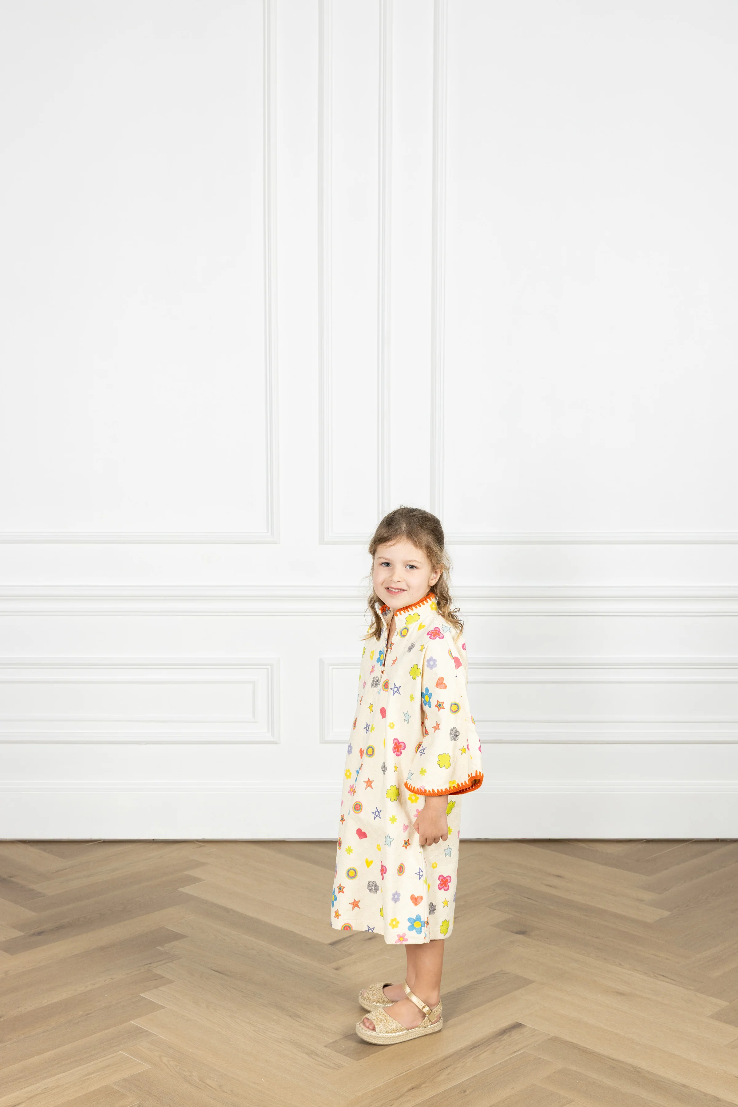 match with your mini! the kid’s caftan is our smaller take on the iconic women’s maxi caftan, carrying the same relaxed shape and bell sleeves in an effortlessly elevated silhouette - just like mom’s. this caftan is crafted in textured canvas and features scattered hearts, stars, and florals in bright hues, framed by a statement orange embroidered trim.