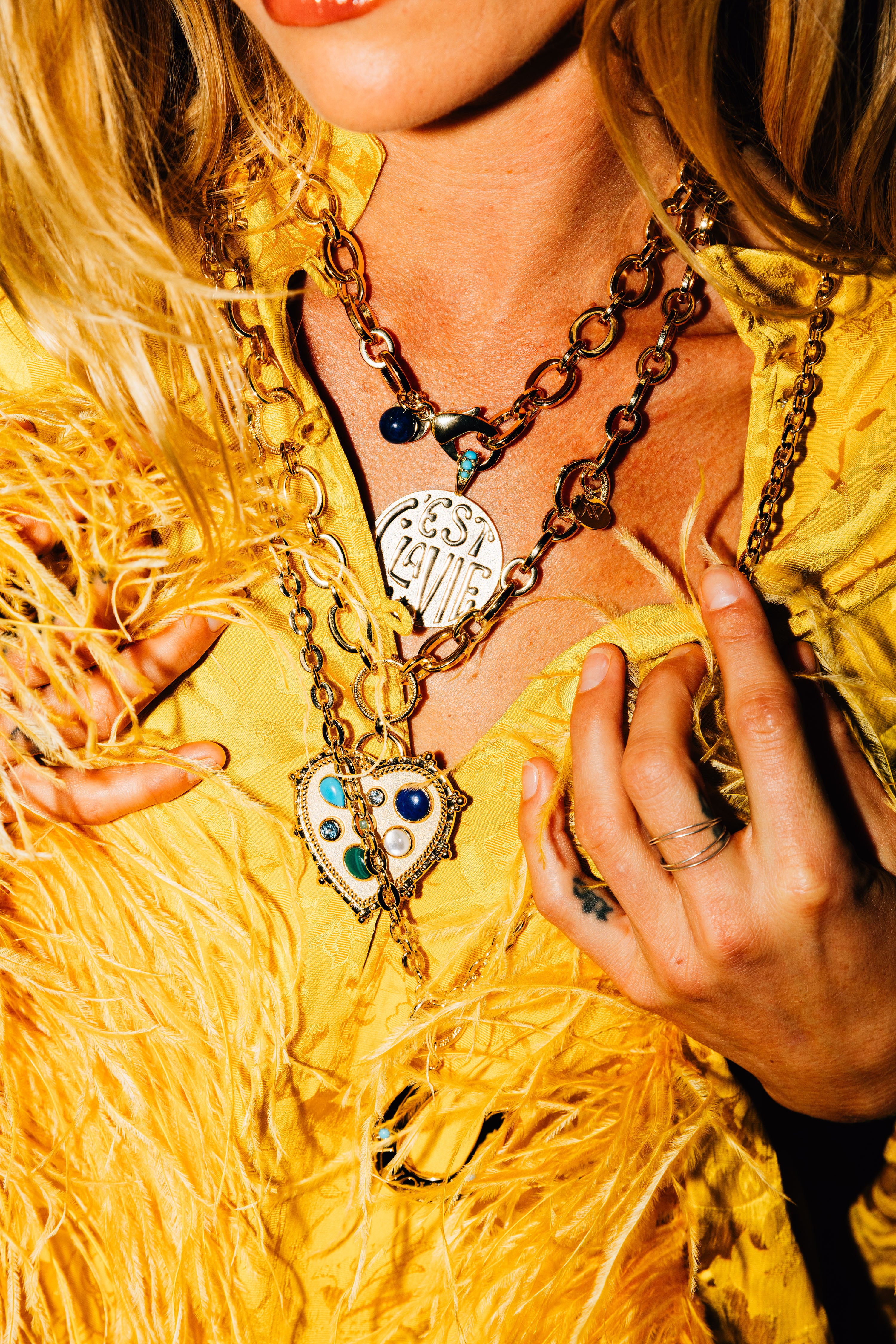 A grande size coin is the centerpiece of the collaboration, married with motifs pulled from the Jane Win collection of coins: Lucky horseshoe, a signature La Vie flower, Greek crosses and of course – hearts. Semi-precious cabochon stones become bolts of color. Meant to be layered with a million gold chains. There’s a bit of a 90’s vibe. Just add caftan for instant style. C’est La Vie!