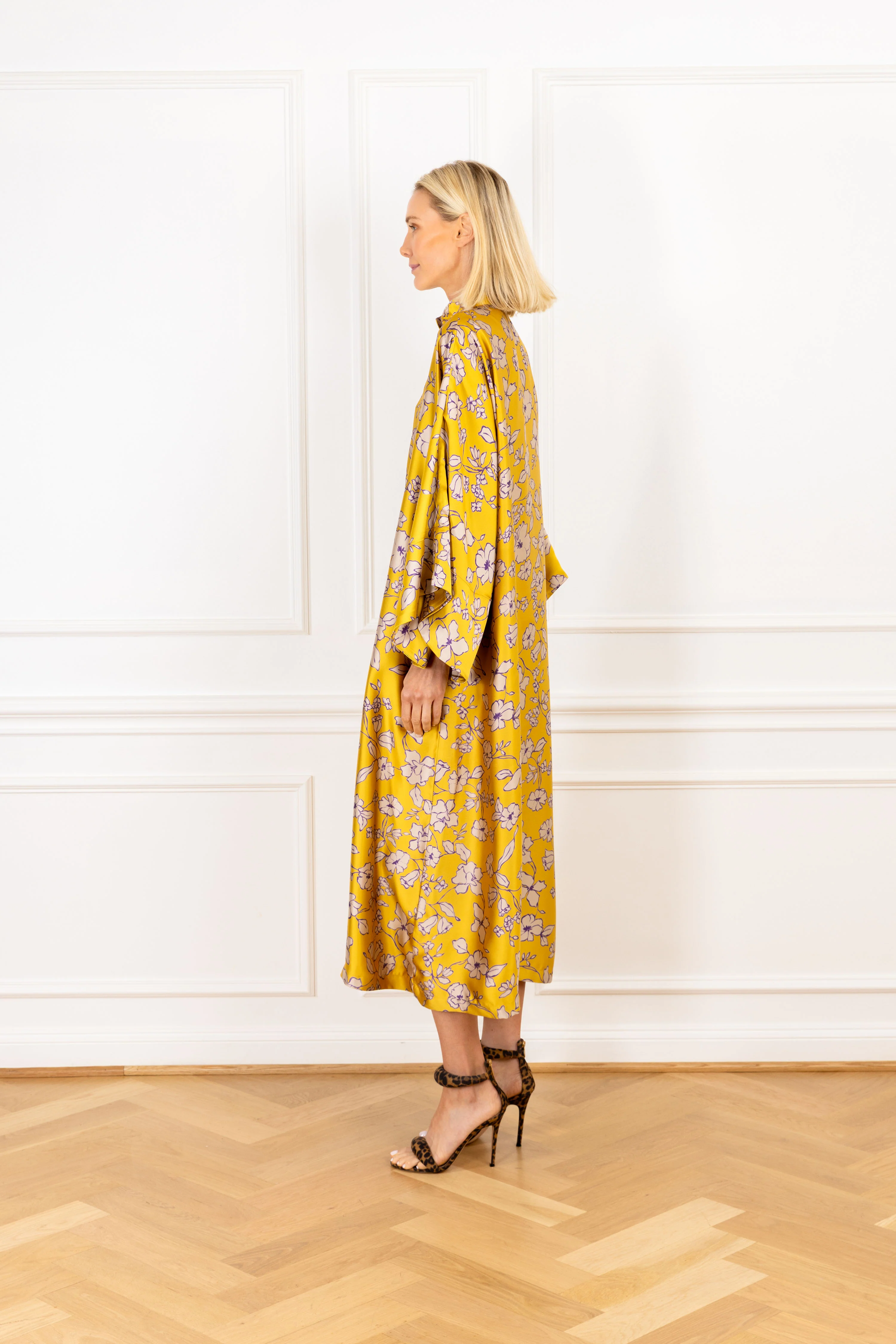 slip on our signature caftan silhouette for an effortless look that feels refined. this caftan features outlined floral motifs in varying sizes scattered across a golden saffron satin fabrication.
