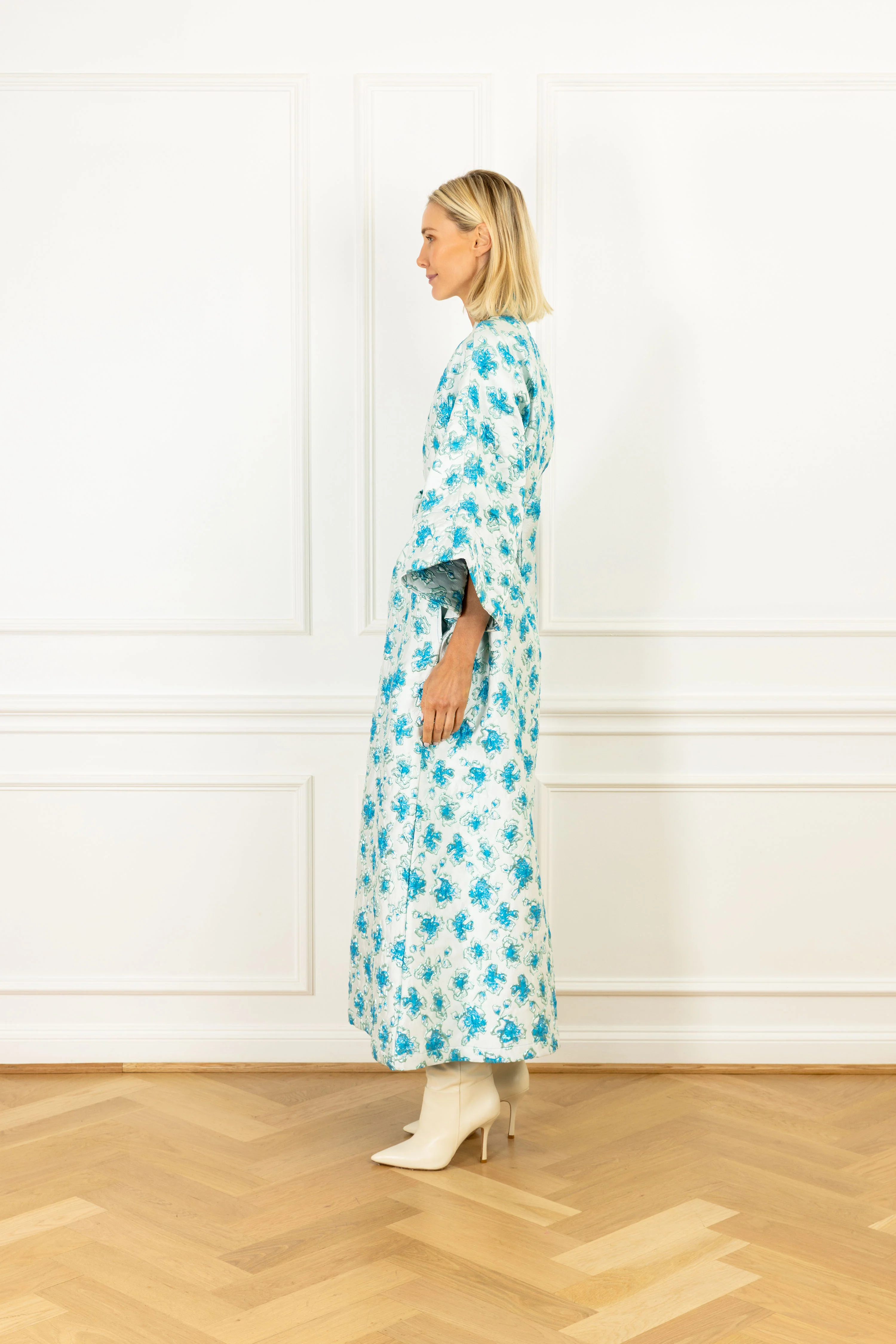 tie on this classic silhouette designed with an effortless flowy feel. this handcrafted piece has an easy drape, and evokes the label's vintage-inspired aesthetic. this wrap features evenly-spaced, stylized florals in metallic blues on a raised brocade fabrication.