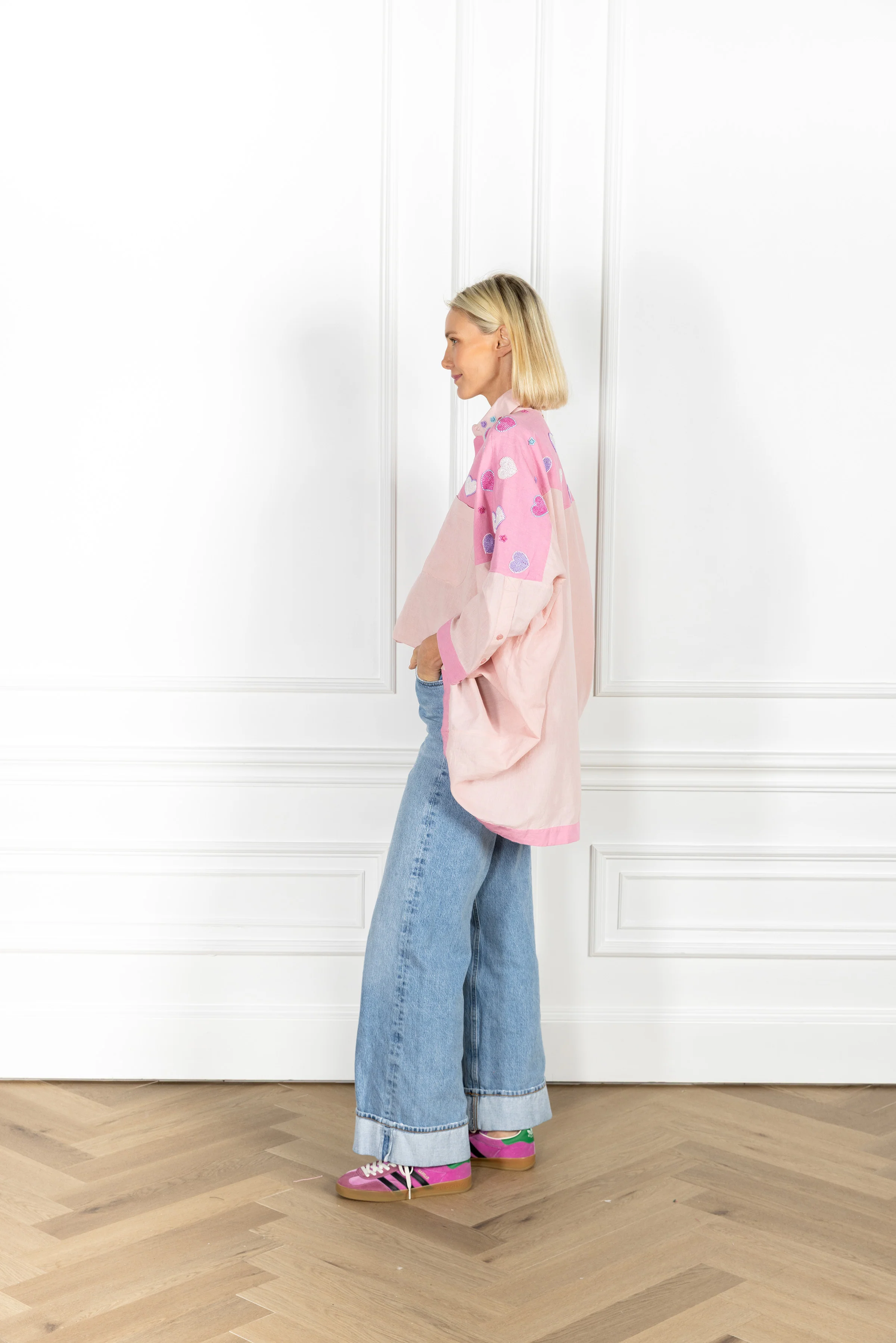the slouchy fit you know and love, designed for an oversized and elevated look. this shirt is crafted from a soft cotton-linen blend fabrication and features pink colorblocking accented with beaded heart and star motifs.