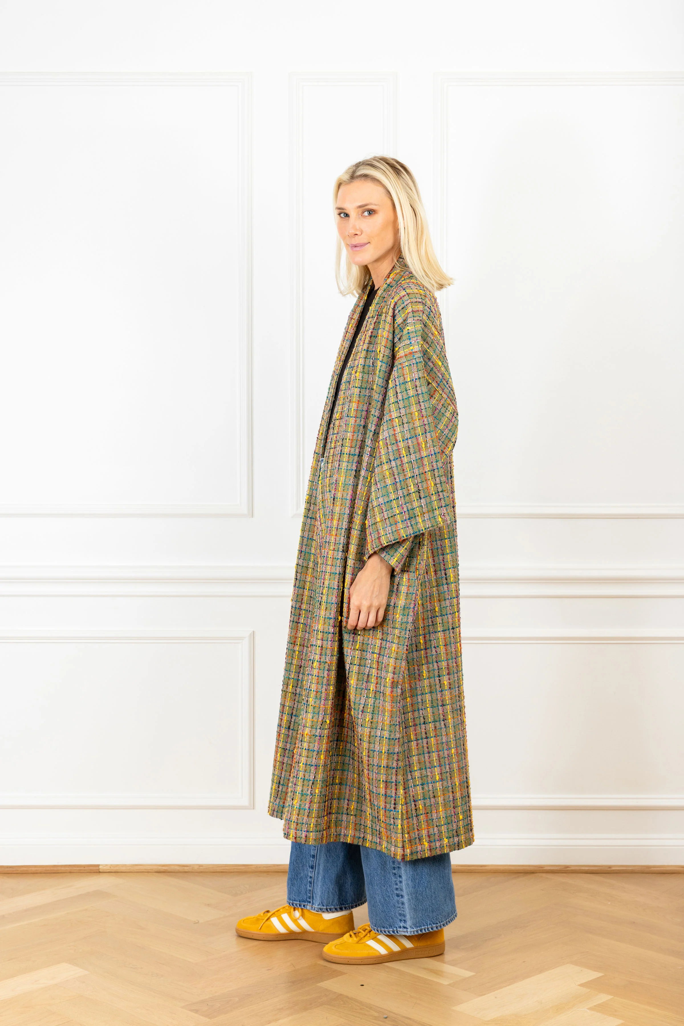 this duster is created from a wool blend featuring a multicolored plaid weave, blending earthy and vibrant tones. this handcrafted piece is the perfect oversized garment for a chilly day, and is the epitome of luxury and comfort wrapped in one.